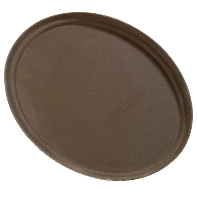 These GRIPTITE oval serving trays reduce labor costs. The toffee tan, 31" oval tray is designed to serve an entire banquet table with just one tray (holds 8 plates). It is stain and odor resistant. The non-skid surface prevents slipping and sliding of glass and dinnerware. The rubber liner is permanently bonded to the tray and covers the the side wall to provide extra grip. It is made of dishwasher safe fiberglass and has a heavy-duty reinforced construction to eliminate warping.