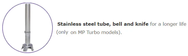 The stainless-steel, 1-1/5 hp motor unit has air vents in the top section to ensure watertightness. The motor housing has a ridge that serves as a rest and pivot on the pan rim for greater use and comfort. The self-regulated speed is versatile, not only can emulsify 12-1/2 gallons at a time but you'll be able to gently mix more delicate dishes or products. The ergonomic handle is designed for greater comfort for the user to prevent tiredness.